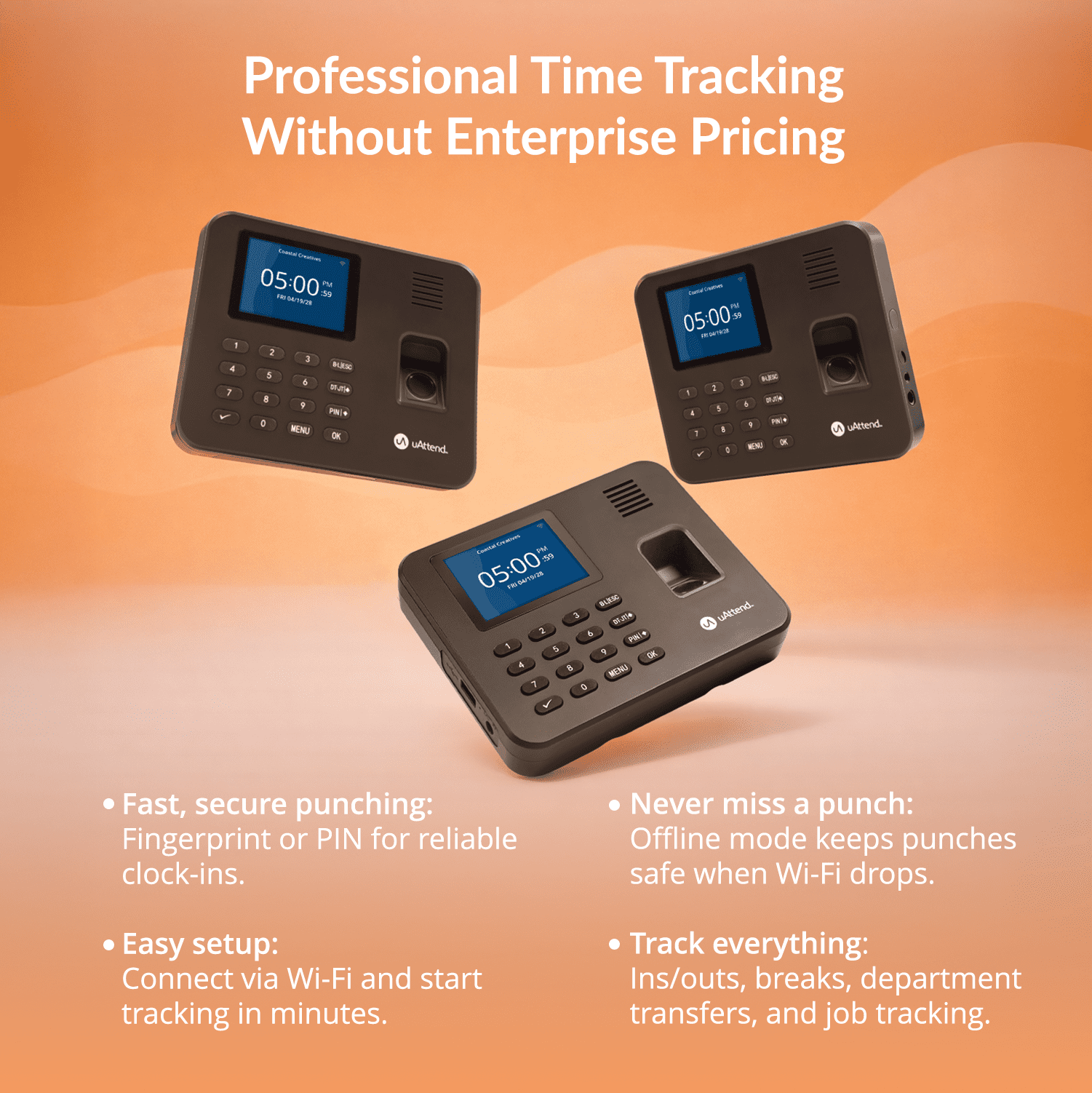 The uAttend RE2000 is built for businesses that need simple, secure, and reliable attendance tracking. Employees clock in with a fingerprint or PIN, and real‑time data updates automatically through Wi‑Fi. If the network drops, the device stores punches until it’s back online.